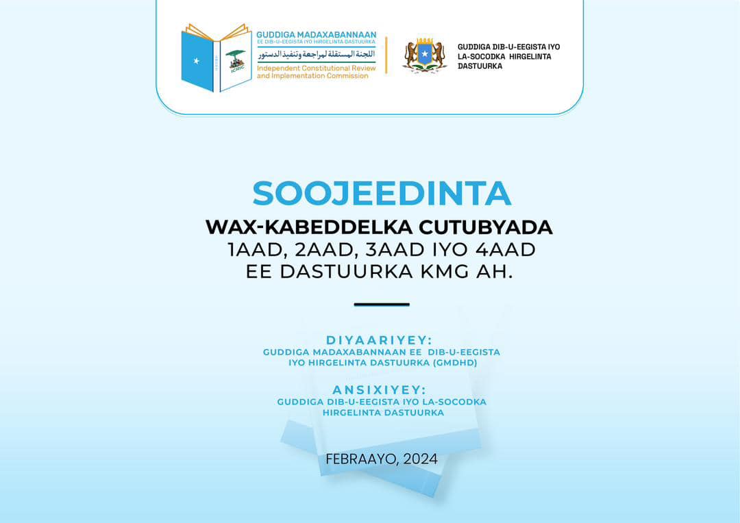 Guddiga Dib-u-eegista iyo La-socodka Hirgelinta Dastuurka BFS ayaa hor geeyay Baarlamaanka Jamhuuriyadda Federaalka Soomaaliya soojeedinta wax ka beddelka Dastuurka Afarta cutub ee ugu horreysa Dastuurka iyo Warbixinta La-socota.